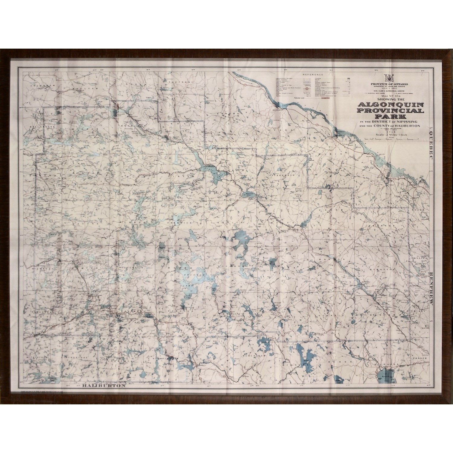 This lovely, hand tinted Algonquin Park map of watery blues and soft ivories invites you to look closer at it's unique character. History buffs will enjoy comparing these early boundaries against the current ones. Produced by the Government of Ontario in 1958. Framed in a rustic live edge, dark stained profile.