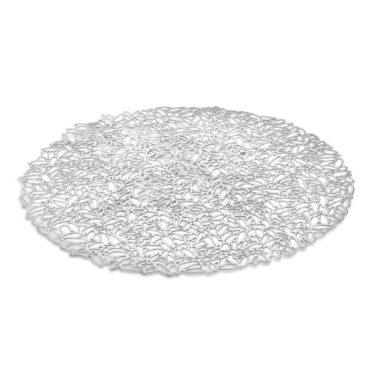 Make your table sparkle with this fine silver round placemat. Its creative, hollow leaf design will elevate your tablecloth and dishes to the next level. Try any casual stoneware or other dinnerware on it and you will marvel at the effect. Appreciate the versatility of the item as it can be used as a charger, placemat, or remain essentially ornamental.