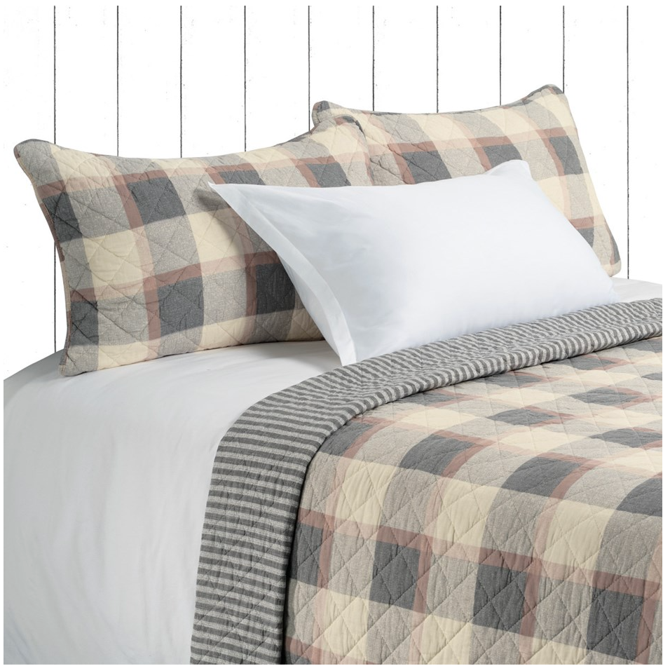 • Cream, grey and tan plaid quilt set