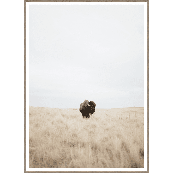 The magnificent Buffalo, or sometimes known as Bison, stands out against the wide plains he once dominated. He seems to challenge you to honour his presence. Minimally framed in a contemporary angled, gray washed profile in large size.
