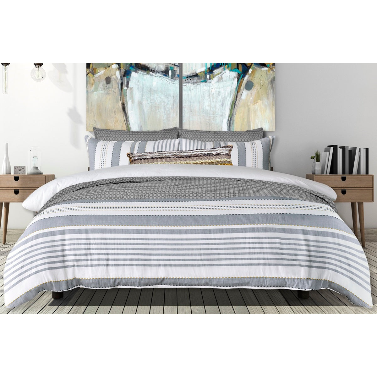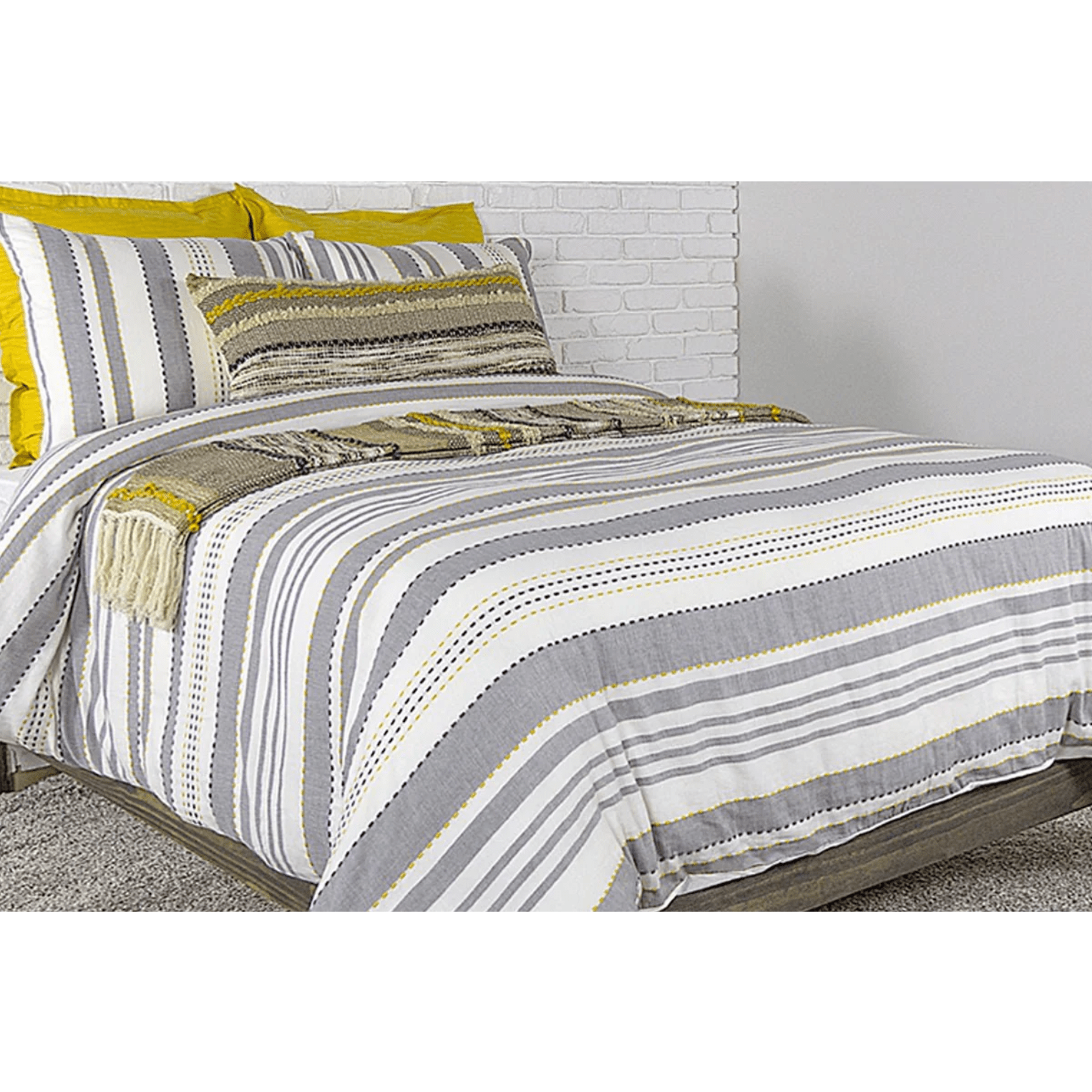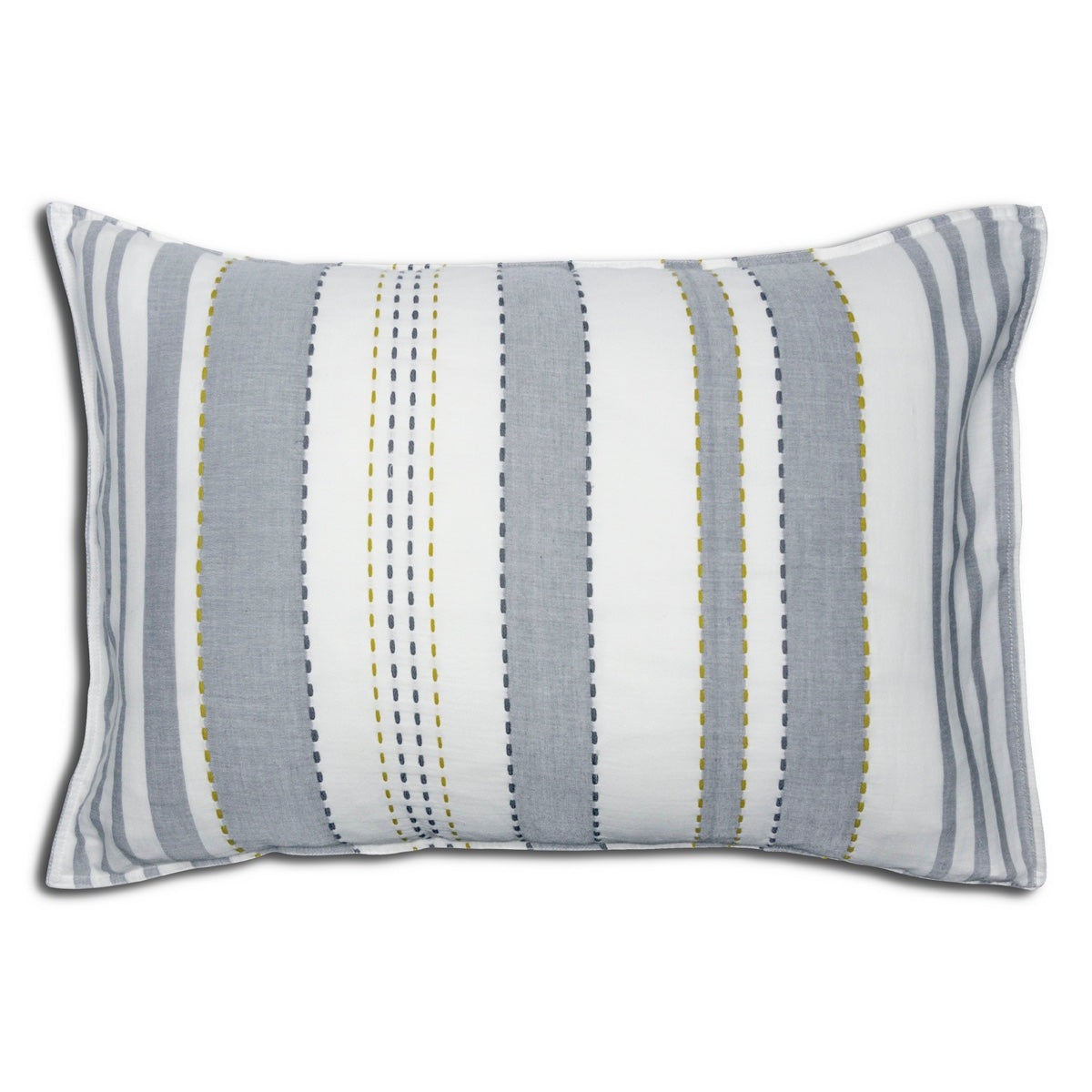 Jaron’s varying stripes in tin with chunky stitching detailing in smoke and marigold add a dash of modern to your bedroom.