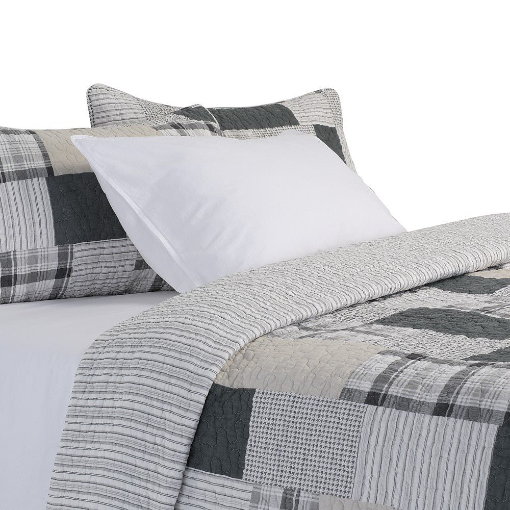 • Printed plaid reversible quilt set in shades of grey, charcoal grey and greige