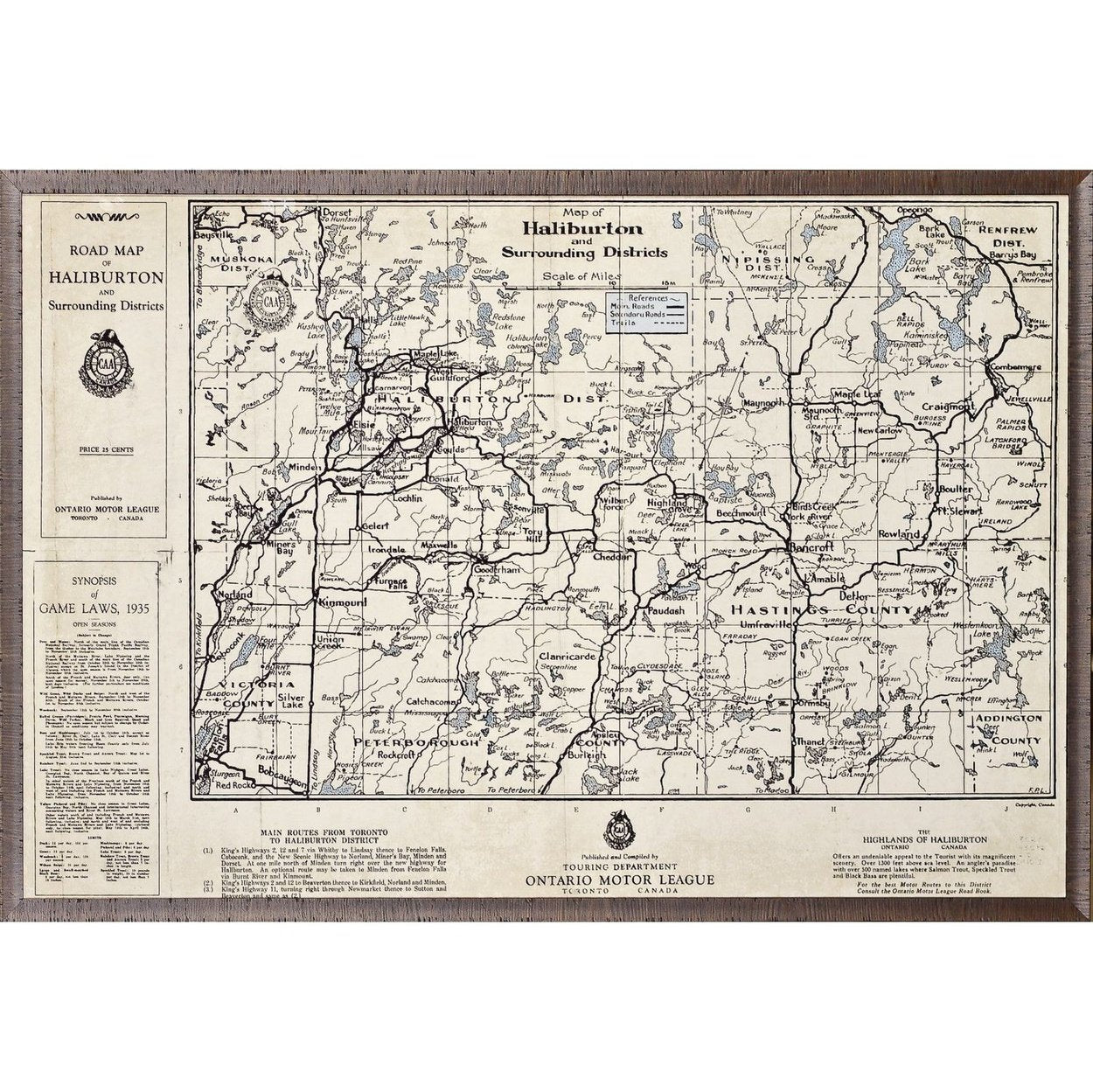 Take a lovely trip down retro, memory lane with this Ontario Motor League, 25 cent, hand tinted district map from a by gone era. Lean in for a closer look at Game Laws and road trips from a earlier day Each is framed in a rustic frame for that Cottage, Modern Farmhouse vibe.