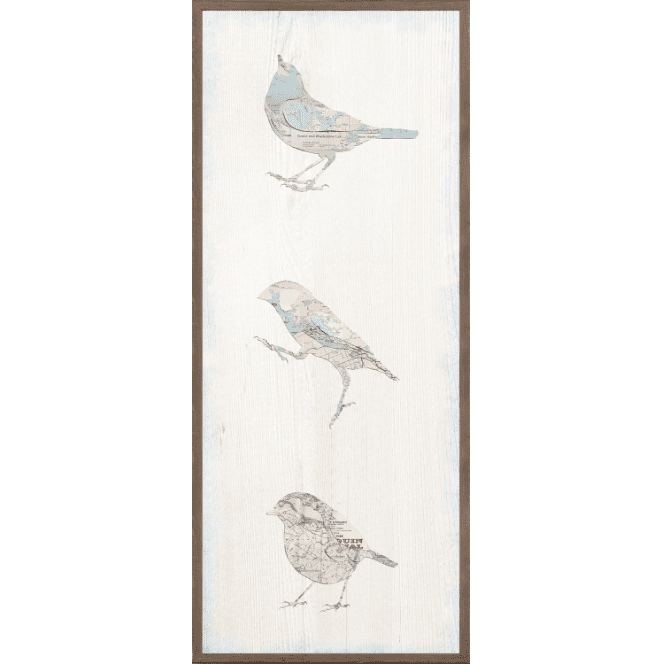 A trio of delightful bird profiles made from vintage Muskoka and Ontario maps set on a wooden board ground. Set in a weathered gray wood, contemporary frame.